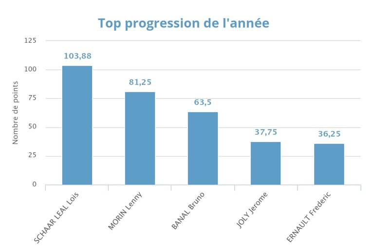 La phase 1 a mis en lumière cinq joueurs s’étant particulièrement distingués par leur progression au sein du club. Leur engagement à l’entraînement, leur régularité en compétition et leurs progrès techniques et tactiques ont permis une nette amélioration de leurs performances. Ces évolutions positives reflètent le travail accompli et constituent un excellent signal pour la suite de la saison.